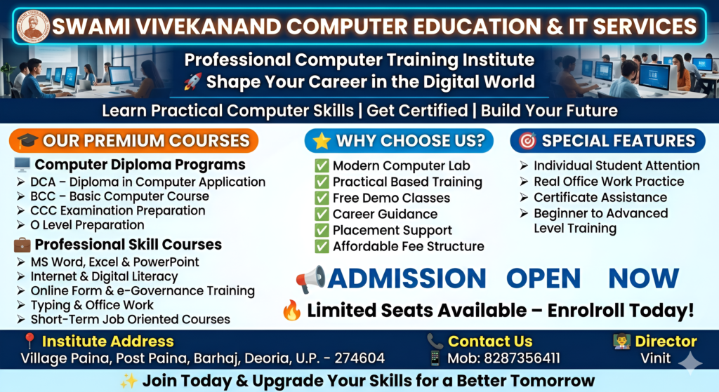 Swami Vivekanand Computer Education is a leading computer training institute dedicated to providing quality education in computer fundamentals, programming, and digital skills. Our mission is to empower students with practical knowledge and career-oriented training.